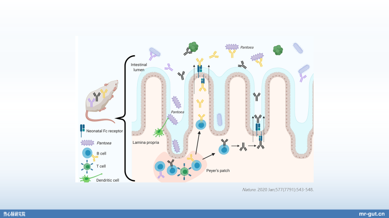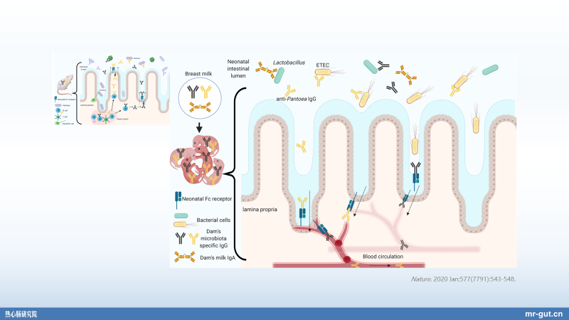 Pantoea,这么一个细菌,它有一个去诱导产生抗体的表位,是跟产毒性的大肠杆菌类似的。如果是产毒性的大肠杆菌在我们的孕妇和孩子肠道里面,实际上是会引起感染的,但是它这个有益菌有一个类似的表位,它不引起感染,甚至还对身体机能有好处。它产生的抗体可以从肠道,通过循环系统进入到母乳,然后同时通过母乳转移到仔鼠的肠道里面去,然后再用产毒性的大肠杆菌去 challenge(攻毒)它的时候,这个小鼠不容易感染。这给我们什么启发?一方面,我们的肠道的营养物质、免疫物质能够输送到乳腺;另外一方面,我们的母乳当中有的这些抗体,给我们的后代的保护作用,就是如此直接的。