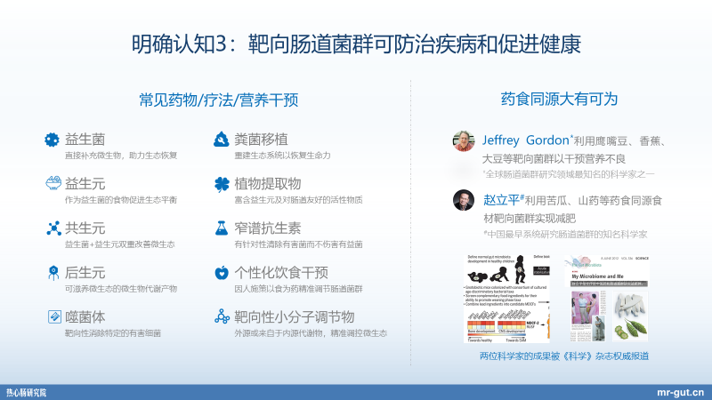 Nature 的子刊都用这些图。所以我想这是第二个非常重要的概念。第三个明确认知就是当我们的生态系统确实出现一些失衡的时候,比如说我们广谱抗生素一吃,就像是森林烧过一把大火了以后,我们如何去恢复这样的生态系统呢?实际上靶向肠道菌群,是可以去防治疾病和促进健康的。而我们的方法,常见的药物疗法、营养干预,这里面实际上现在至少有 10 种方向。第一个就是我们的益生菌。当然未来在儿童成长发育过程当中,我们还会有全营养产品,我们还有针对特定的儿童,比如过敏的儿童,我们也有非常多的这种产品解决方案。其实未来更多,当然我也希望包括达能这样的国际大牌,一起用中国的一些传统的食药同源的方案,用更好的、中国妈妈们更接受的方案。包括在营养方案方面,我们可能可以有更多选择,比如在四川说不定有辣味的营养制剂,然后在东北我们可能还有这种东北风味的营养制剂等等。我是觉得都是有可能的。未来,我们都需要站在更多的科学研究、更多地在这么一个生态系统的基础之上去思考,所以刚才我觉得有三个认知:第一个,我们人体是一个菌群与人体自身所构成的生态系统;第二个认知,人类是一个营养命运共同体;第三个认知,我们靶向肠道微生物,是能够去治疗疾病,也能去改善健康的。