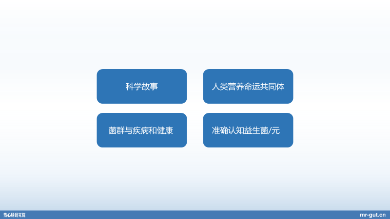 第一个方面讲讲科学故事;第二,我给大家介绍个非常重要的概念,叫做人类营养命运共同体;另外,菌群到底是怎么样去影响疾病和健康的;最后给大家简单地科普一下,我们应该如何正确地、准确地去认知益生菌、益生元。