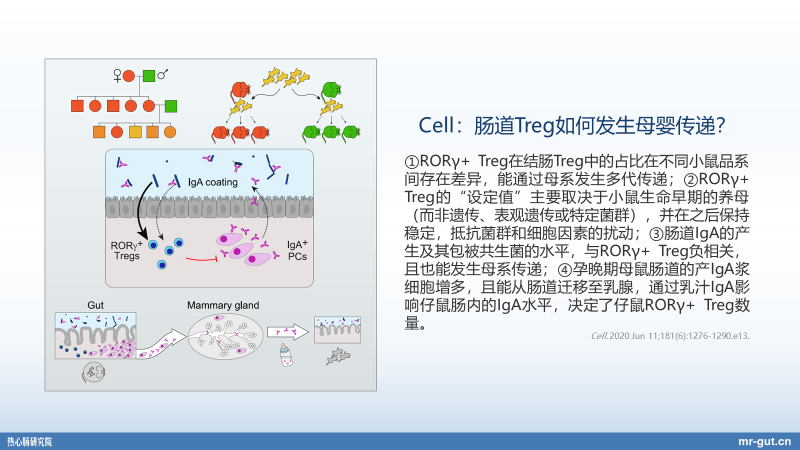 在这个研究当中,被证明出来还有一个非常重要的,就是母体还有可能把特定的 T 细胞进行母婴传递,但是它不是直接传递,而是通过也是类似于抗体的传递。比如说我们的 IgA 在母鼠的这种体内,它可以去促进特定的 T 细胞产生,然后产生这种特定的抗体 IgA 的浆细胞,就会从肠道转移到乳腺当中,然后乳腺会把这样的浆细胞所产生的抗体——因为它在乳腺当中分泌这样的抗体了——传递给仔鼠,然后仔鼠的特定的 T 细胞就会受到抗体的调节。