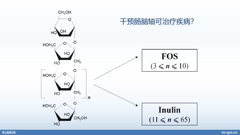 居然肠道与大脑之间相关的关联这么大,那么我们去干预肠-脑轴是不是可以治疗疾病?所以我们来看一个结构,这个结构大家非常陌生,但是把这个放出来,不少人就知道了。在我们不少的爱他美的奶粉当中,实际上有 FOS(低聚果糖)和 GOS(低聚半乳糖)的添加。