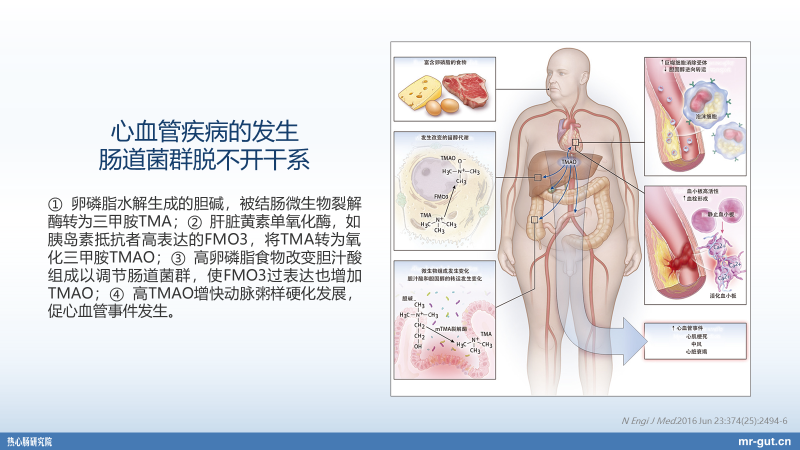同时比如说我们在心血管疾病发生过程当中,也会看到比如说,我们吃了大量的胆碱、肉碱,红肉或者说鸡蛋黄当中的这种卵磷脂,这种类型的物质如果吃过量了以后,会被肠道菌群代谢成三甲胺。三甲胺入肝了以后,会被代谢氧化三甲胺。氧化三甲胺会在血管里面去促进血小板的激活。血小板激活了以后是不是促进凝血?大家剌了一道口了以后,那么我们实际上是血小板来促进凝血,那就会促进血栓。在这个时候,我们就发现这整条路径实际上是与肠道菌群密切相关的。