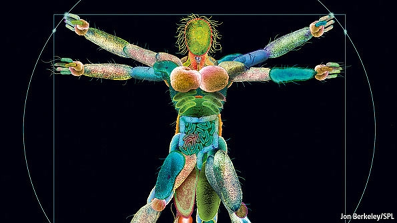 第一个是,人体是自身与菌群组成的共生生态系统。两者间实际上是协作,甚至是生死共存亡,互相地进行这些细胞层面、分子层面的这种交互,携手来行使整个生态系统的功能。比如说,我们人体有 40 万亿个细胞,但我们人体里面的细菌也大概有 40 万亿个细胞,实际上它的细胞数跟我们是差不多。但它们的基因数,每个微生物可能只有几千个基因,我们人有 2.5 万个基因左右,但是它有几百个物种,所以累积起来了以后,它的基因数会超过我们几百倍。这么多的基因,在我们身体里面,它不会没事可干的。那么在我们进行营养代谢,在我们发生疾病,在我们进行相关的成长发育,甚至神经系统的成熟的时候,它都发挥着非常关键的作用。所以站在这么一个角度来看,实际上我们看,整个地球是一个生态系统,而我们地球当中的生命,动物与土壤与植物组成了一个由微生物中介的这么一个生态系统。实际上我们人也不是如此吗?你看这也是我非常喜欢的一张图。