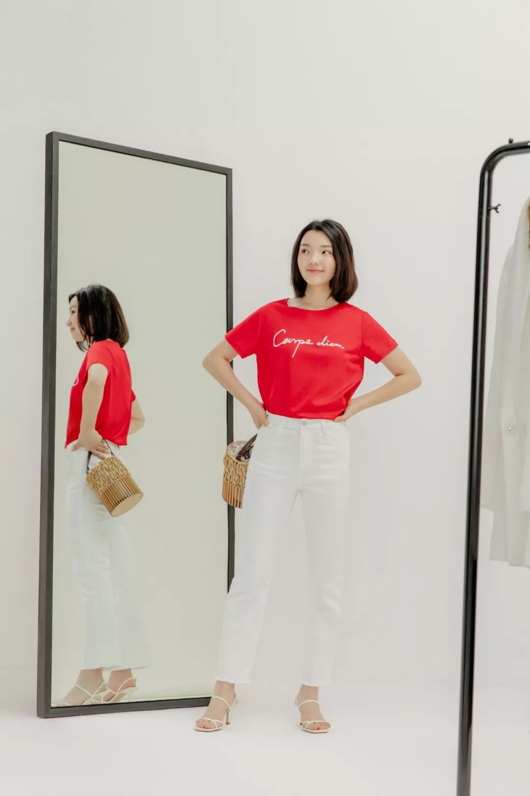 搭配竹编包和白色凉鞋