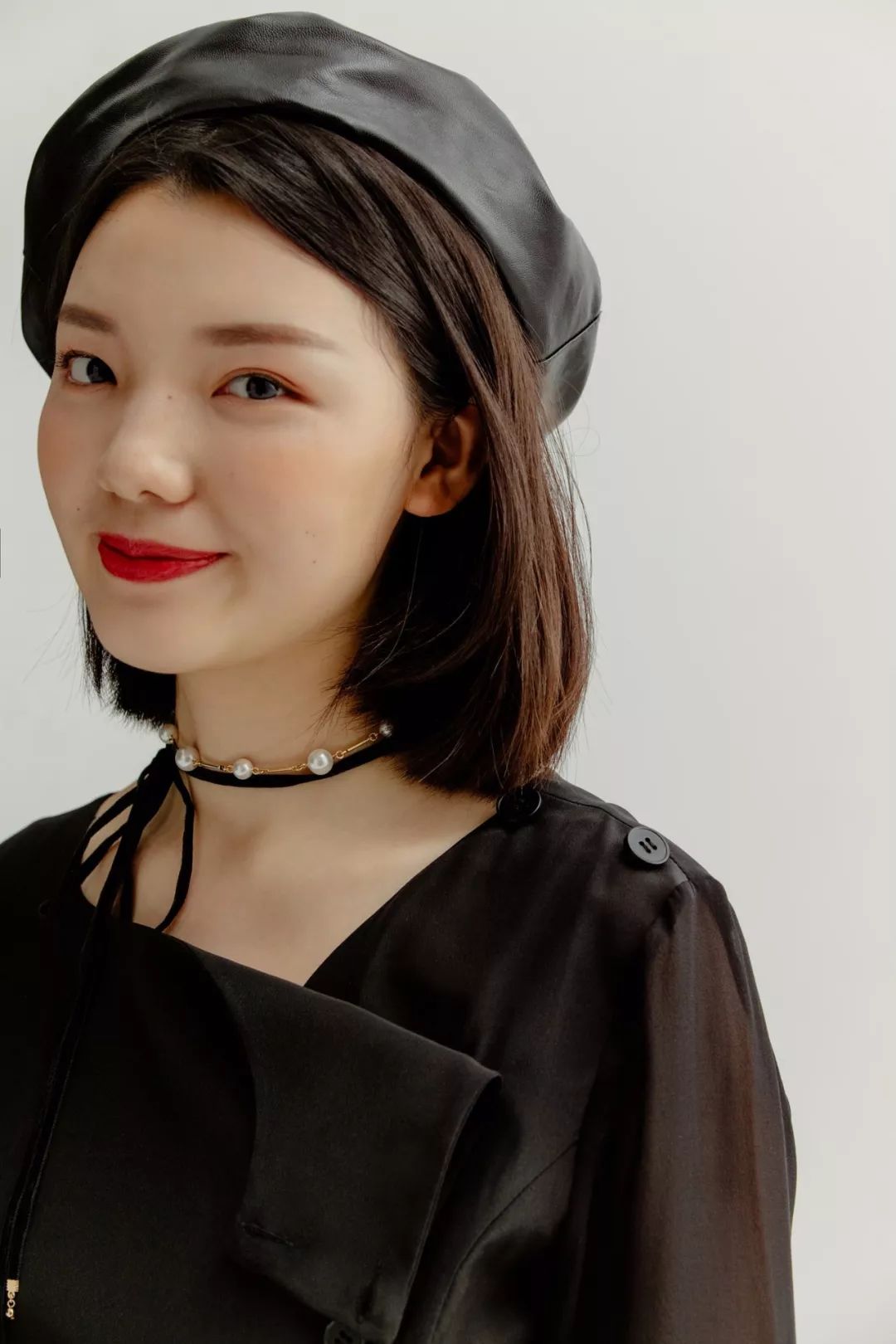 搭配皮质贝雷帽和珍珠choker