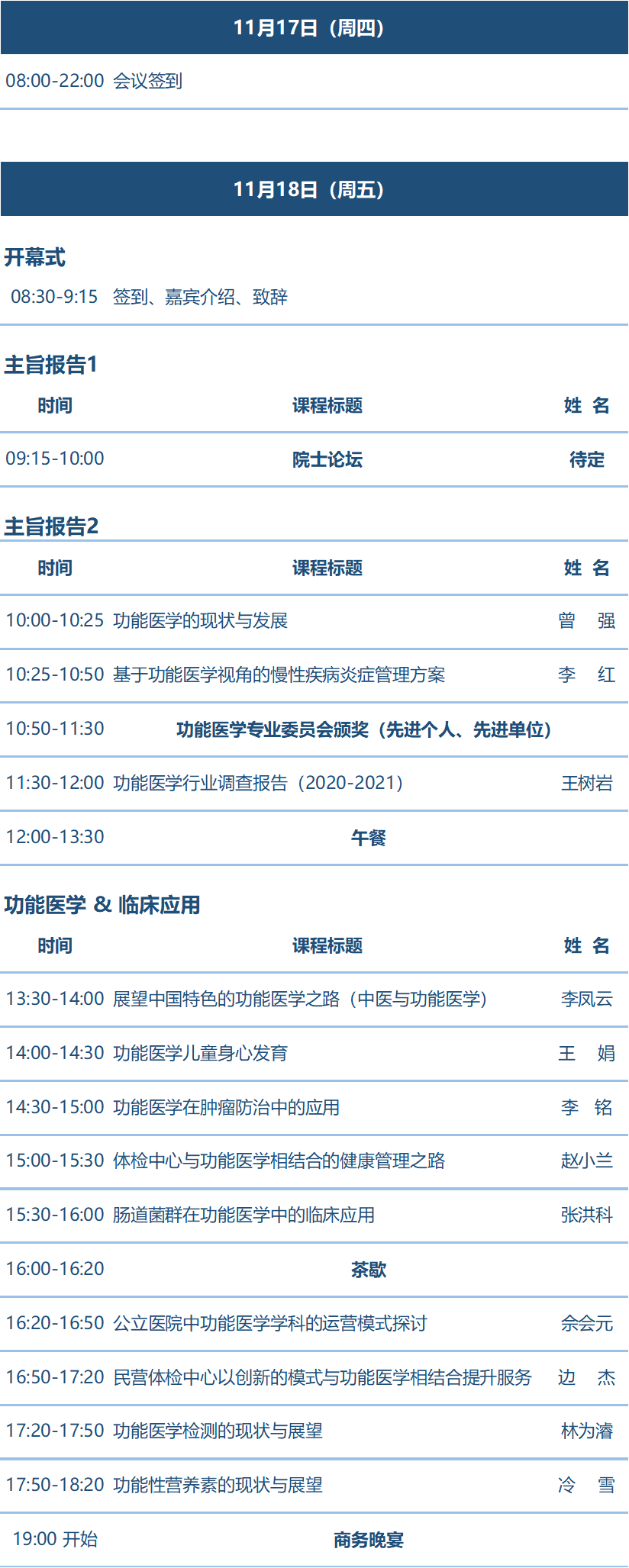 | (含会议资料费+18日、19日喜来登商务午餐+18日商务晚宴+《2020-2021功能医学行业调查报告》1本) | (含直播+回放+纸质版《2020-2021功能医学行业调查报告》1本) |