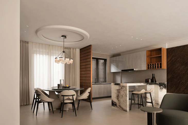 客厅在简约奢华中融入禅意呼吸感,米色极简模块沙发,自然米色系轻柔治愈。餐厅赋予内敛奢华的黑色,深色的圆餐桌和黑色的餐边柜,辅以细节处精致而考究的构造工艺,营造出高级而低调的就餐环境,餐区的实用与美观完美融合。