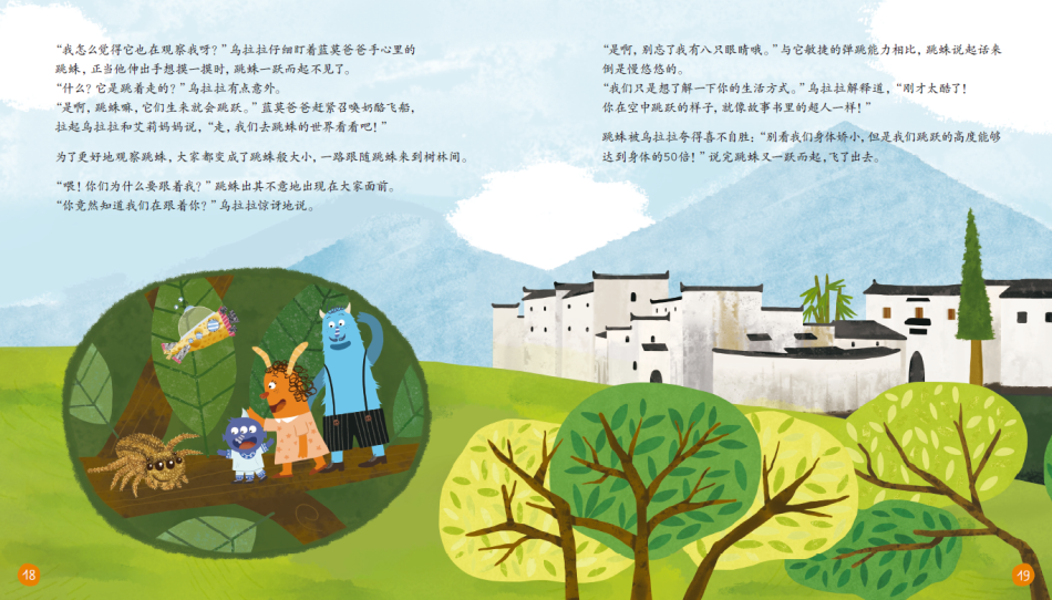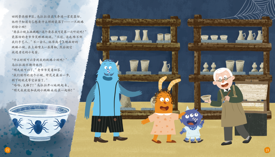 《小怪兽乌拉拉苍蝇虎是谁?》说的是乌拉拉一家来到中国江西省的景德镇的见闻。乌拉拉在景德镇遇见了苍蝇虎(又名跳蛛),乌拉拉在了解了跳蛛后,喜欢上了跳蛛,突发奇想,让景德镇的匠人给他在瓷碗上画上了跳蛛。