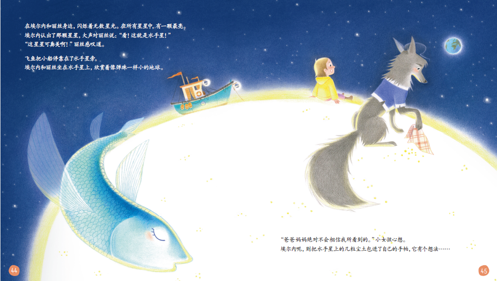 再比如,故事《海浪和小女孩》用简单直白的语言,构建起海狼和小女孩的奇幻经历,大海、飞鱼、星星……这些美妙的元素交织成一场浪漫的冒险。在这个故事中我们能隐隐感受到梦想、超越、友谊这样深远的词汇,可在文字的表达中并没有出现。一页页具有强大视觉冲击力的画面把我们带入一个奇幻的梦境,让我们不禁感叹:坐在水手星上的海狼和小女孩是否有如小王子附体?