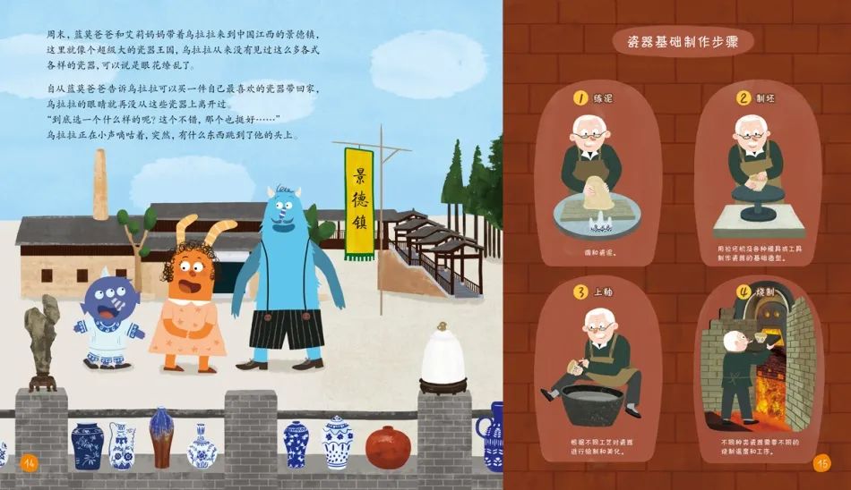 故事中还展示了景德镇瓷器的制作步骤,图文并茂,一目了然!有助于小读者们更形象和立体化地了解著名的景德镇瓷器。