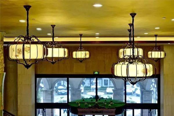 大厅顶部没有用硕大的水晶灯,反而用了中式风格的小灯,充满了灵动感,恰到好处的点缀着顶部,又与整体风格相一致。