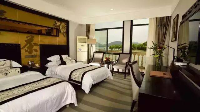 静泊山庄内共有15幢别墅,每一栋别墅都赋予了与茶相关的名字,茶花楼,茶韵楼,茶经楼......拥有168间具有中国茶文化特色的湖景水景房,每个房间配有品茶区,茶具及茶叶展示,还设有茶文化走廊,可以了解各种茶文化的知识,可以说把茶文化表现的淋漓尽致。