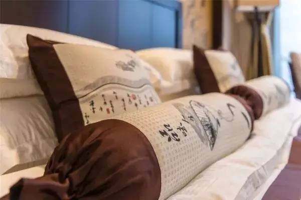 中式写意风格的被罩,配上泼墨山水画的靠枕,极富诗意。床头背景墙是一面茶色的壁纸,灯带修饰下三盏精致的茶壶,好像在时时提醒着你别忘了体验一番品茶的乐趣。