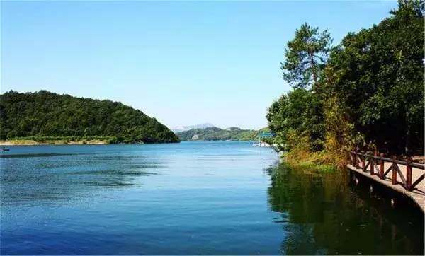 湖周群山环抱,湖水清冽,间有画若棋盘的田畔,疏密错落的茶园,到处是一幅幅纯自然的田园风光图。