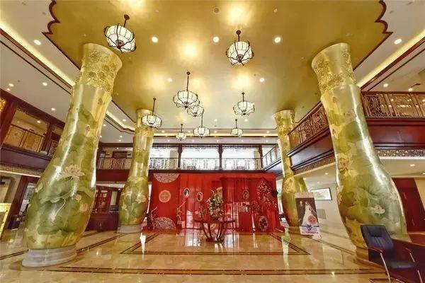 走进大厅,挑高的楼层,四根粗壮的柱子,画着精美的荷塘美景。前台就在左侧,背景是一副巨大的中国山水画,显得大厅格外的大气。中西合璧的风格,出人意料的和谐。