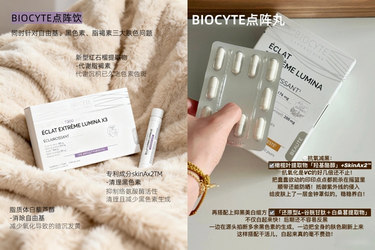 ———对于初次尝试BIOCYTE或者预算有限的,美白丸本身就是一款优秀的入门选择。而对于已经投资点阵系列的你,这次换购等于以极低的成本,为你的高效美白方案上了一道“双保险”,实现1+1>2的协同效应。让它肌肤在高效代谢的同时,保持在稳定、健康的状态。