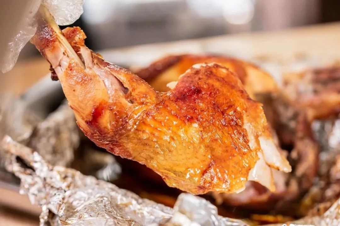 烤鸡独特香气来自传承核心配料,秘制配料八角、桂皮、枸杞、人参,等二十多种中药材,研磨粉碎,均匀地涂抹在鸡身腌制12个小时。