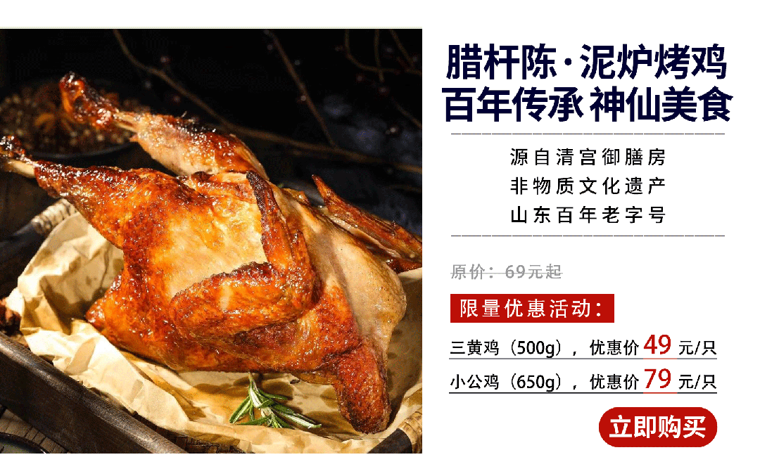 泥炉烤鸡(三黄鸡)500g,原价69元,优惠价49元/只,89元/2只;