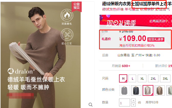 某宝的德绒保暖内衣,单件上衣就要109元↓