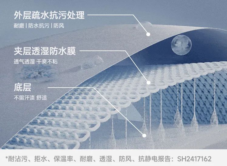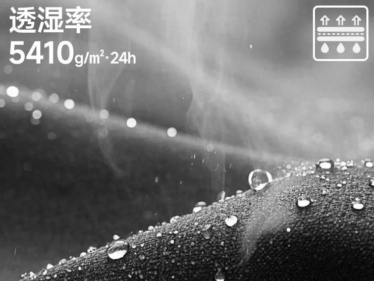 面料中层使用微孔薄膜贴合,微孔允许汗湿排出,但阻止液态水进入,同时具备防水和透湿性。