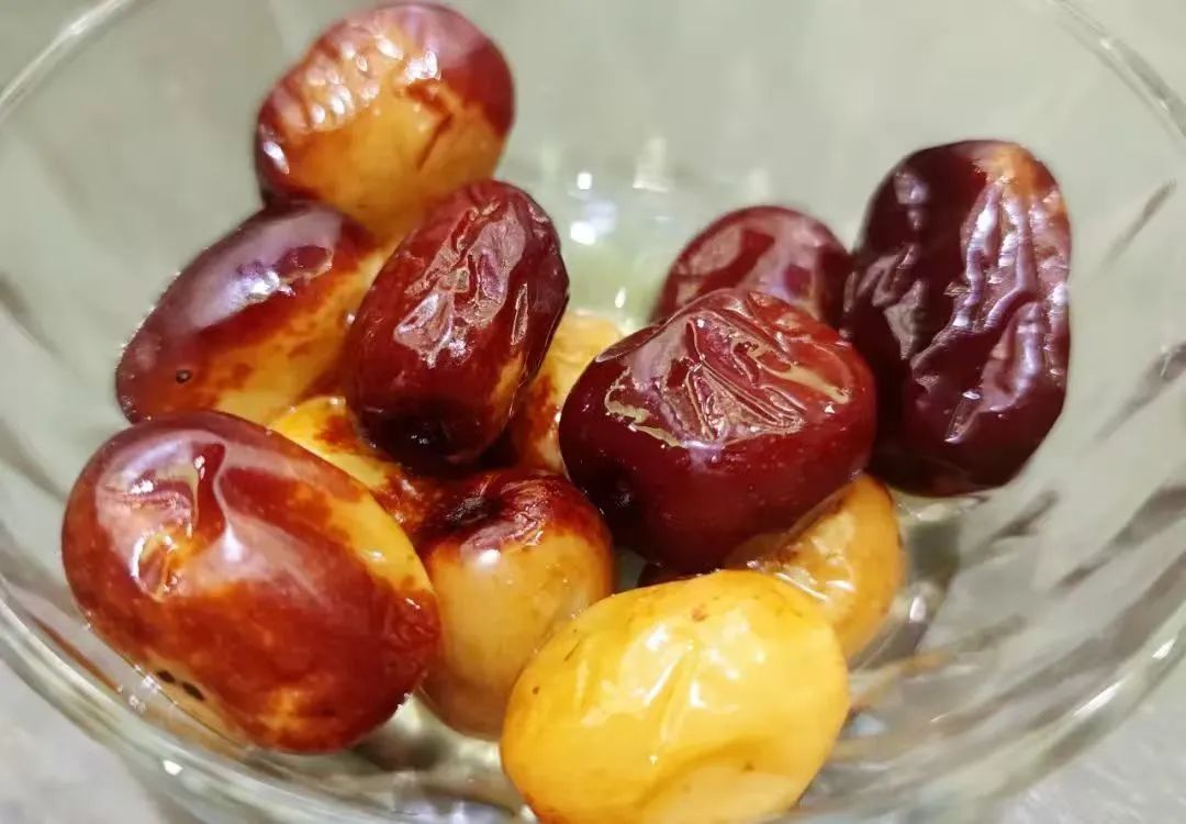新鲜的枣外层有一层膜,一般是用来保护水分和糖不流失的,水煮开后,白膜会自动消失。而将枣切开则容易让营养元素流失,但一般都在煮枣的汤汁里,因而一定要把汤汁烧干,糖分收干。