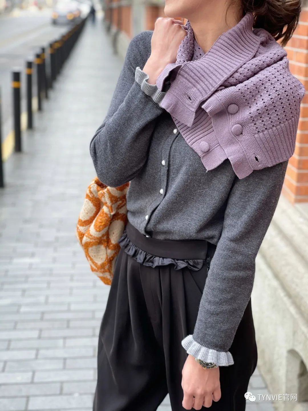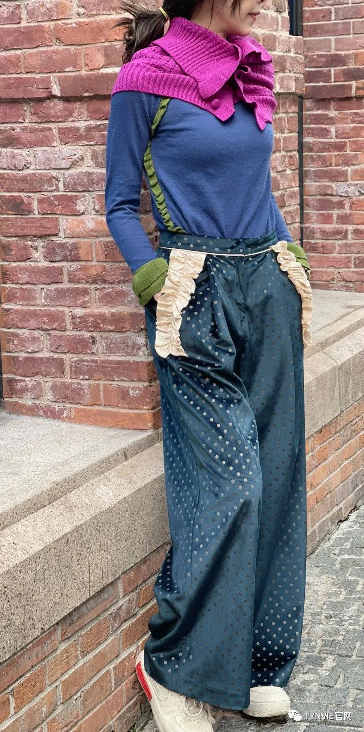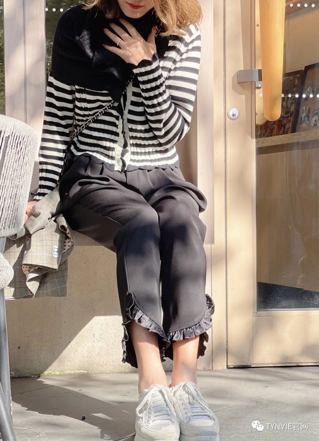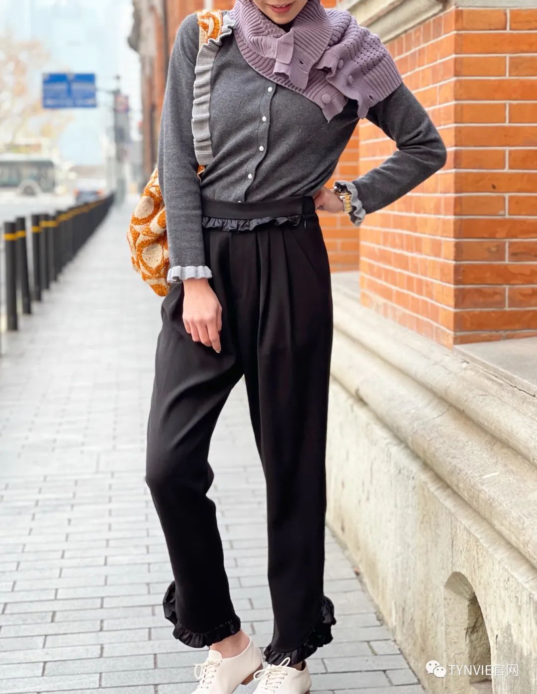 永远都不要小看装饰花边。虽然在整件衣服中没有功能性的作用,但是加上花边和不加花边完全就是两件衣服。衣服主体上的装饰和紧凑的花边呼应,没有多余的东西,一套look的小心思就是简洁又好看。