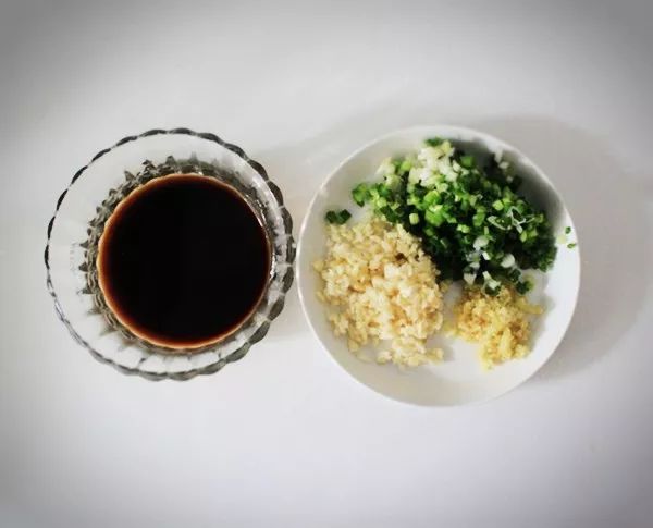 2、将葱花,姜片,蒜片各取出1/2,切成末,添1勺白糖,1勺陈醋,1勺生抽,3~5滴老抽,2勺水,1/3勺淀粉搅匀待用;
