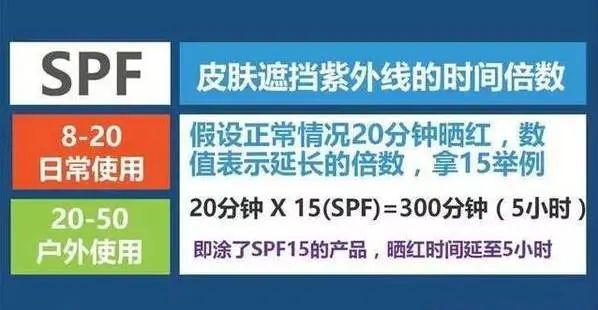 SPF指的是防晒系数,也就是防止皮肤晒伤、晒红的时间,SPF的指数越高,防护的时间就越长。防晒时间=SPF(数值 15,30,50…)*10。一般来说,日常选择SPF15-30就足够了,长时间的户外运动就选择SPF50。