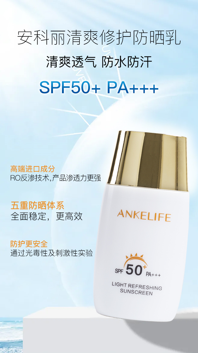 安科丽清爽修护防晒乳,SPF50+、PA+++ , 日常通勤使用完全没问题。