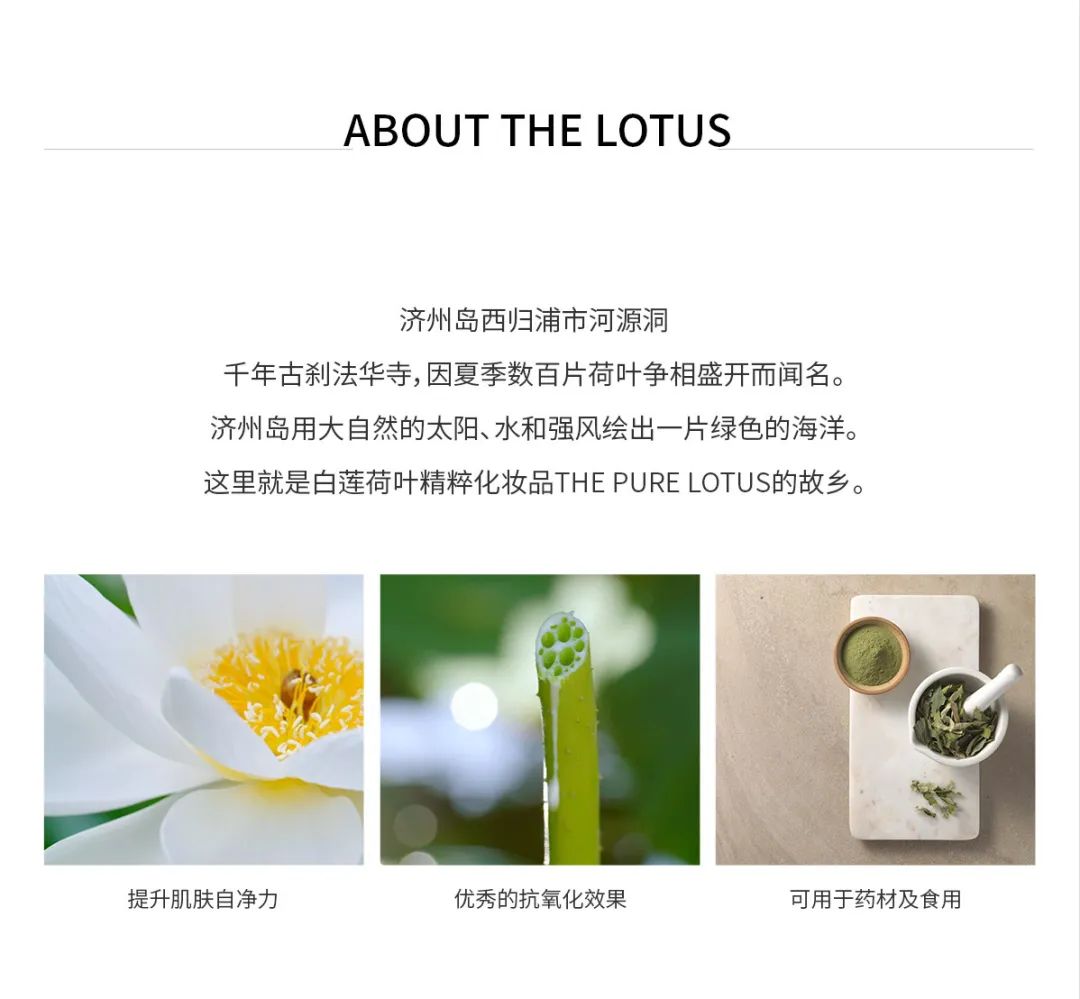 荷叶虽长于污泥中,却有顽强的生命力和洁净能力,the Pure Lotus萃取莲叶自净成分,赋予肌肤自我清洁能量。