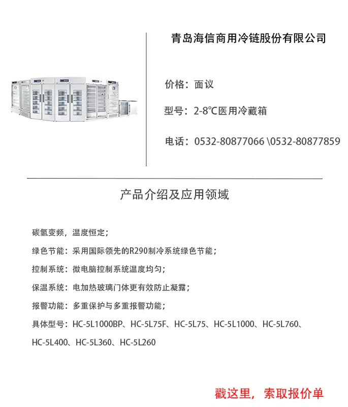 医用产品包括(超)低温冰箱、医用冷藏箱、血液冷藏箱、药品阴凉箱、生物样本库管理系统、冷链监控设备、智能疫苗柜等。广泛服务于科研机构、医疗卫生场所、疾控防疫系统等高端技术领域。