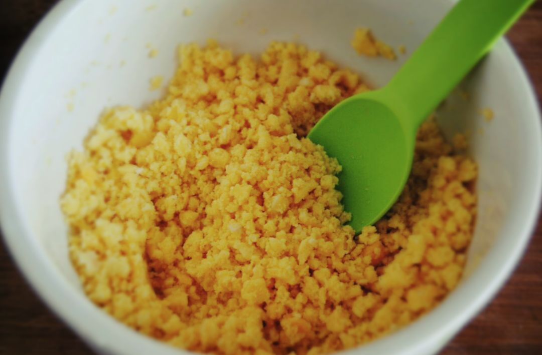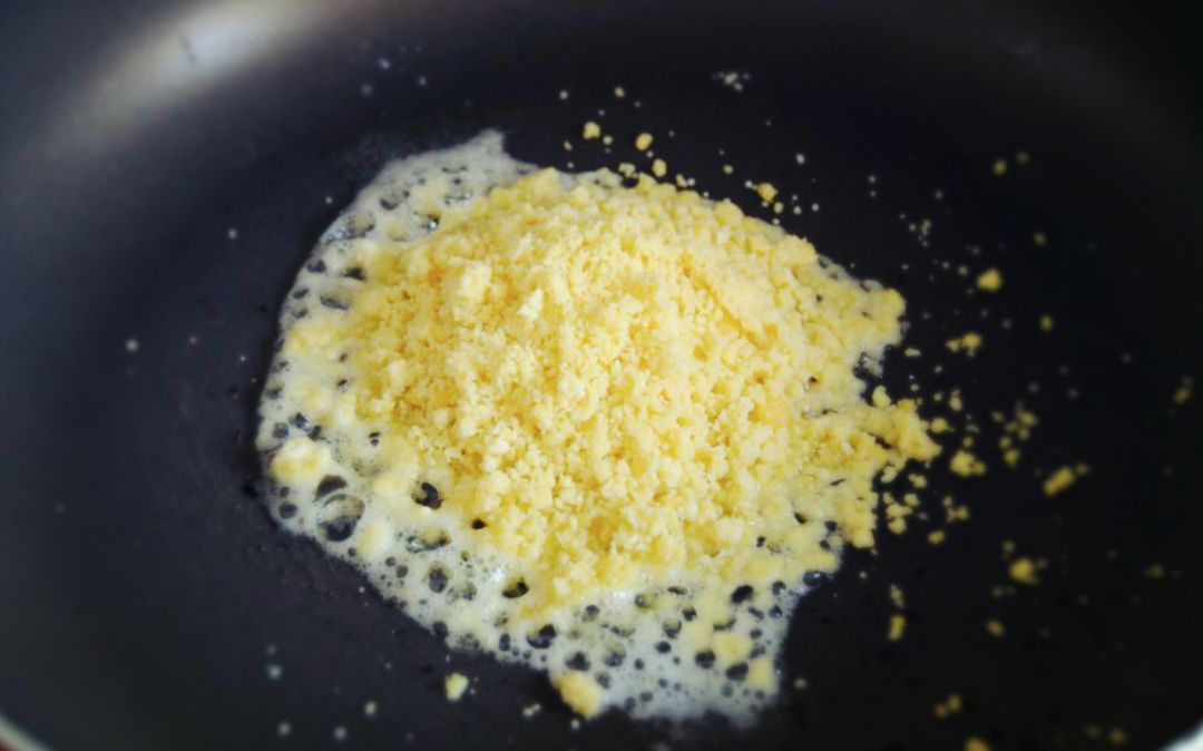 3、锅中留稍许底油,放入蛋黄末煸炒;