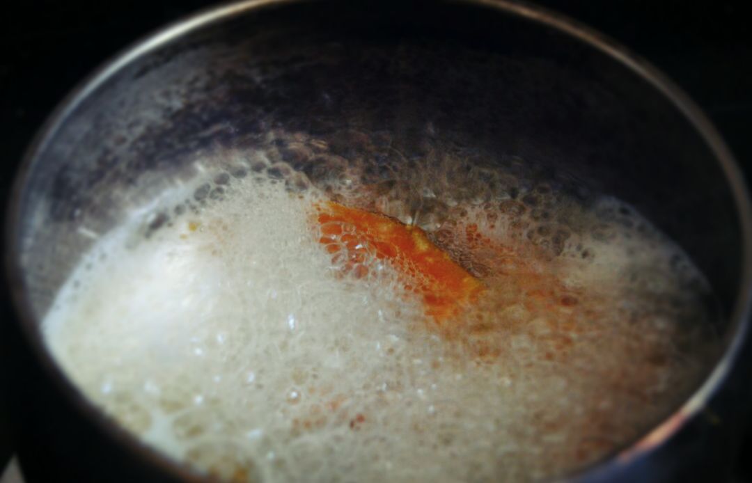 4、炒至起沫时,放入2捏盐,半捏白糖炒匀;
