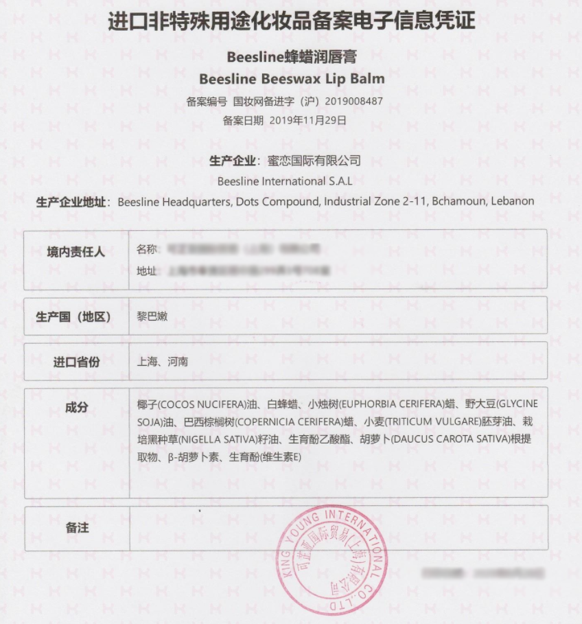 Beesline的唇膏是黎巴嫩原装进口,经过海关及国检检测认证,获得进口化妆品备案电子信息凭证。