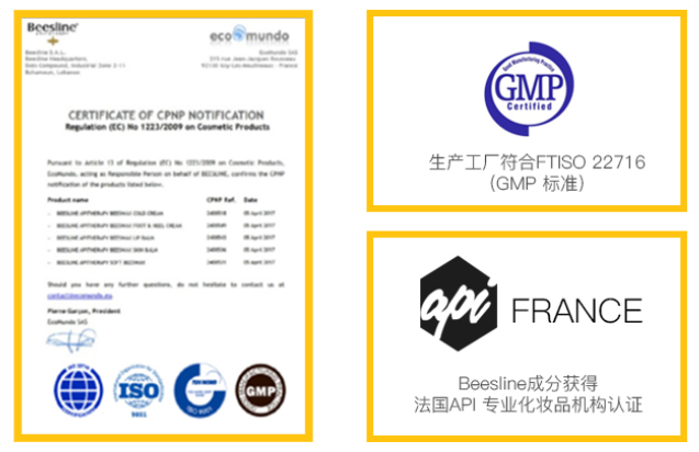 在质量上,beesline经过欧洲认证,生产工厂符合FTISO 22716(GMP标准)和法国API专业化妆品机构认证,也获得皮肤科医生的推荐,放心使用。