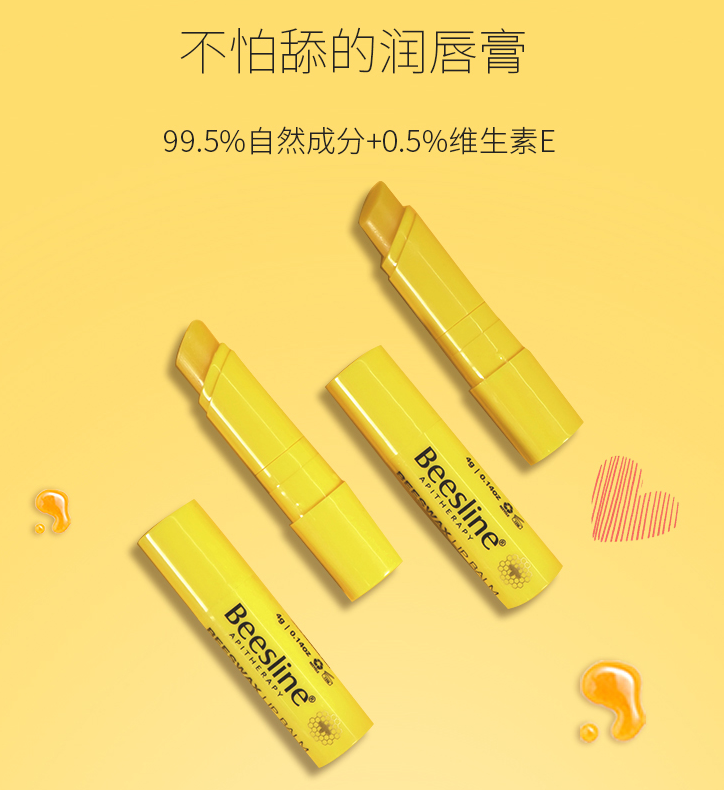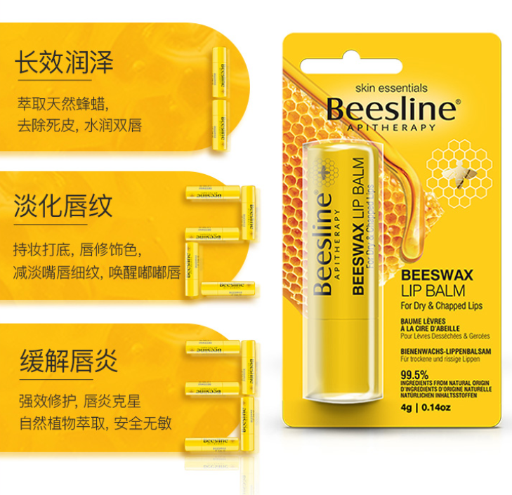 随着年龄的增加,嘴唇皮肤会越来越薄,beesline润唇膏富含维生素A,持续锁住水润,加速唇部更生。