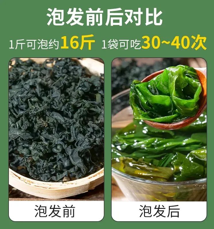 一泡发就像刚从海里打捞采摘的一样新鲜!颜色清新翠绿,不会发灰或者异常发绿。