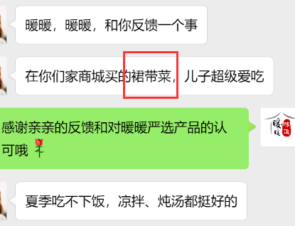 不光我,前几天,有一位宝妈跟暖暖私信说:商城买的裙带菜深受她的喜爱,家里人也十分爱吃。暖暖听到这个消息后,心里简直比吃了蜜还甜!