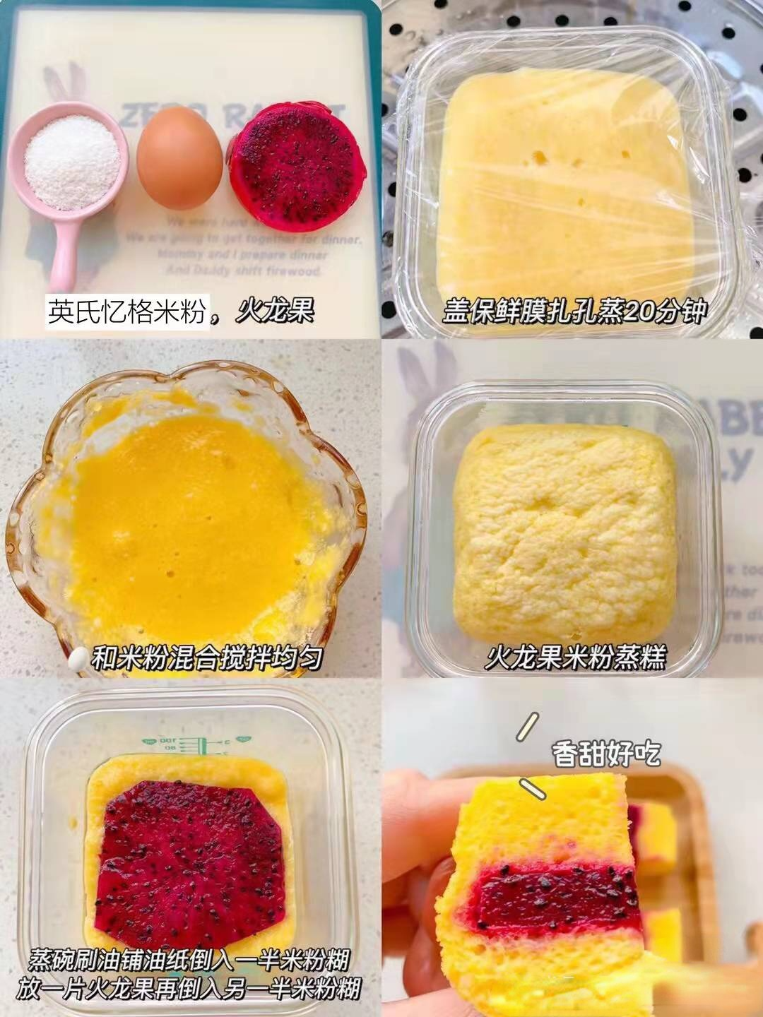 做法:米粉和 鸡蛋混合搅拌均匀,蒸碗刷油铺油纸倒入米粉糊,中间夹一片火龙果,再倒入另一半米粉糊,上锅蒸20分钟即可。