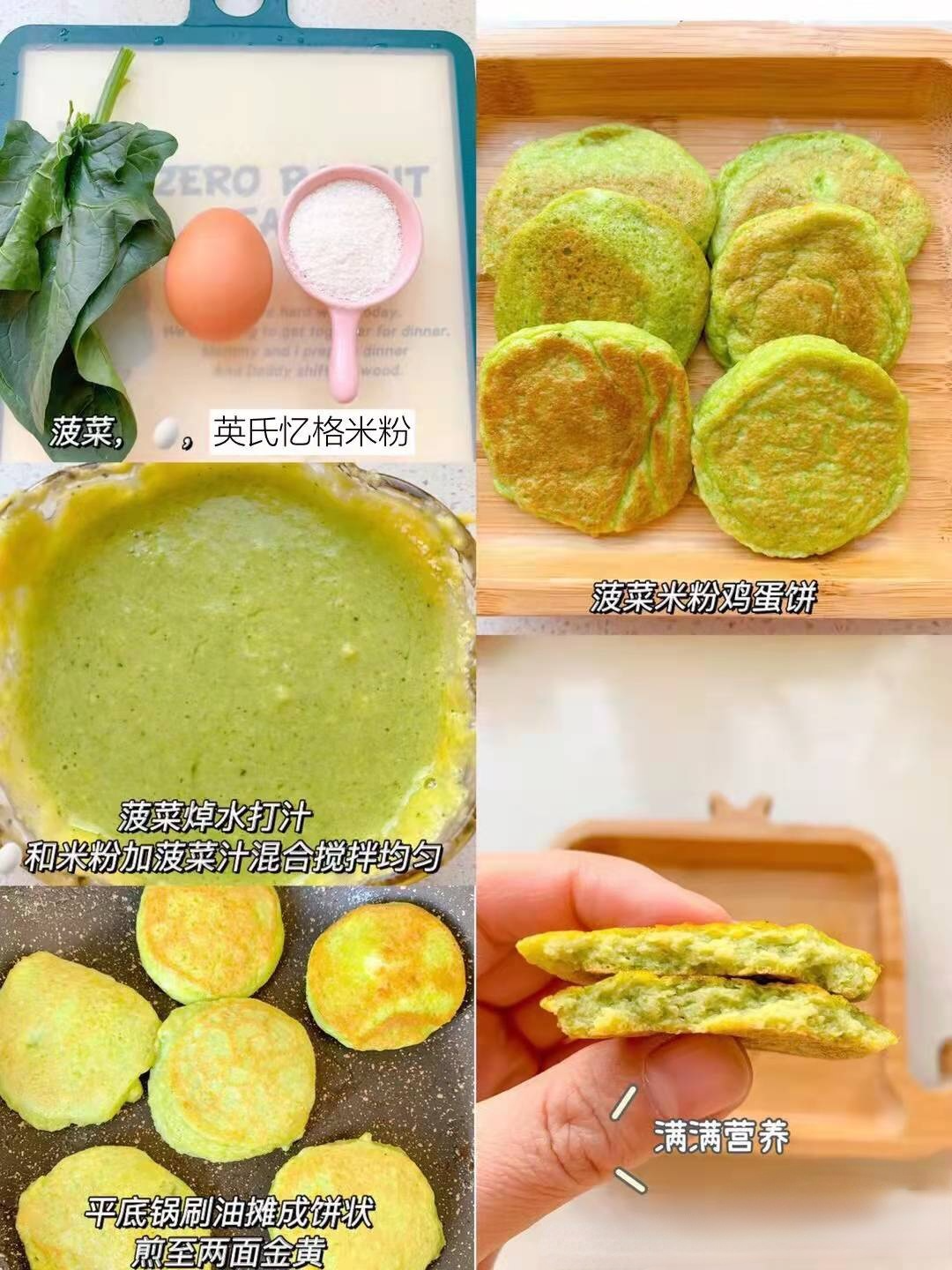 做法:菠菜汁,鸡蛋 ,米粉混合搅拌均匀,锅中刷油摊入小饼,烙至两面金黄。