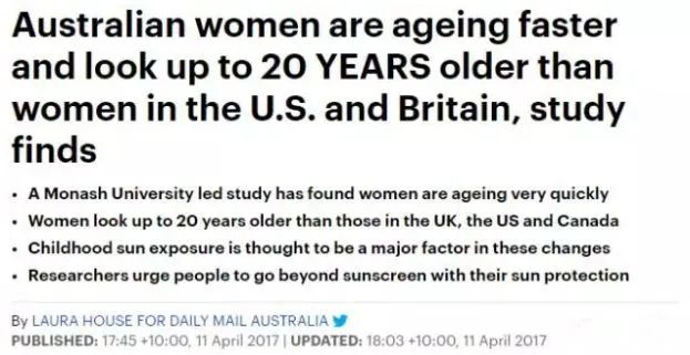 《澳大利亚每日邮报》就揭过自己的短:因为旺盛的紫外线,让澳洲女人,看起来比同龄的美国、加拿大和英国女人,要老20多岁!