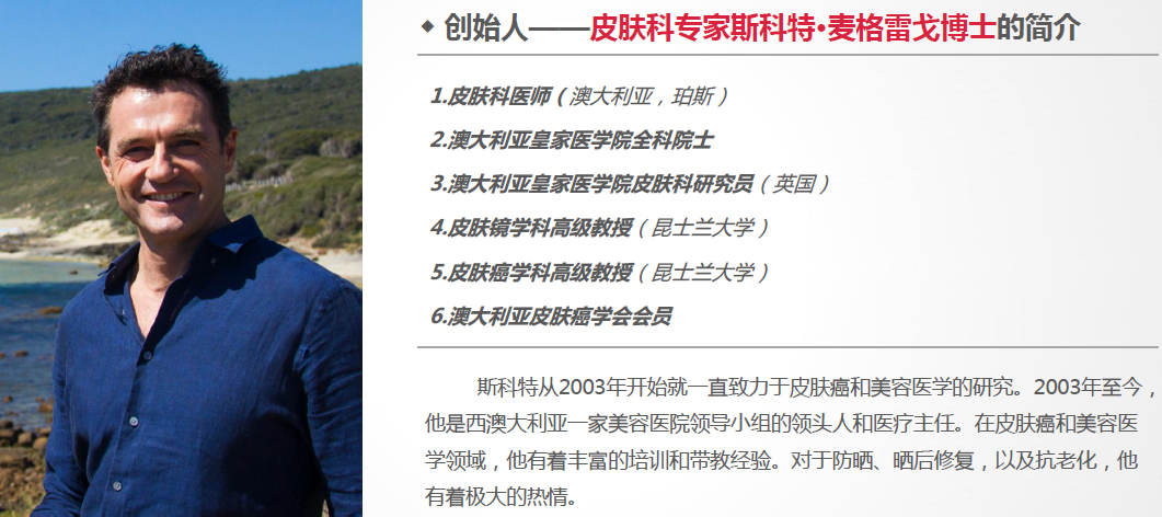 这款防晒的品牌创始人Scott McGregor博士,是澳大利亚有名的皮肤学博士,一直致力于皮肤癌与美容医学的研究。