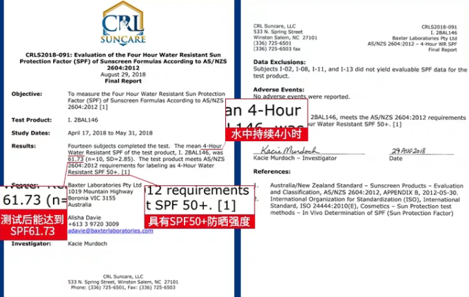 这可不是瞎说的哦,这款就有接受过澳洲权威第三方机构检测,即便是在水中活动4小时,这款防晒的防晒值仍然能高达SPF61.73(保持SPF50以上)。