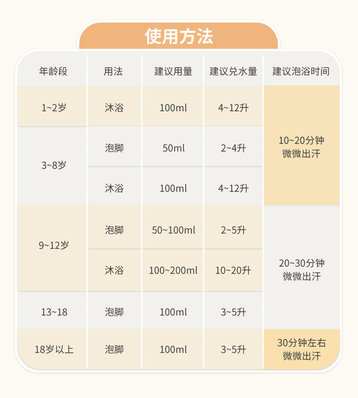 宝宝泡浴的时间和用量可参考下表: