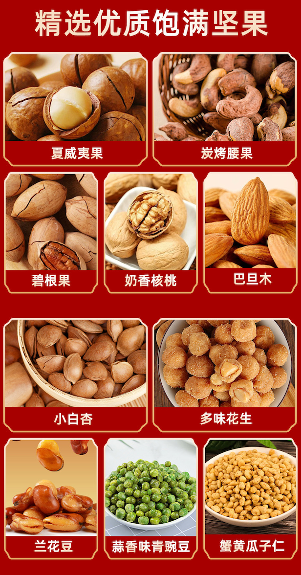 ✅奶香核桃/夏威夷果/巴旦木/碧根果/碳烤腰果/小白杏/多味花生/兰花豆/蒜香味青豌豆/蟹黄瓜子仁
