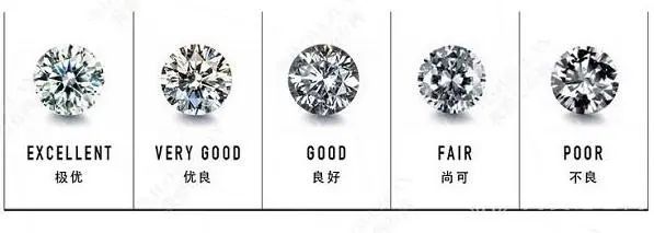 钻石按切工可分为EX、VG、G、F、P5个等级,“EX”等级最好,意思是完美、理想级。