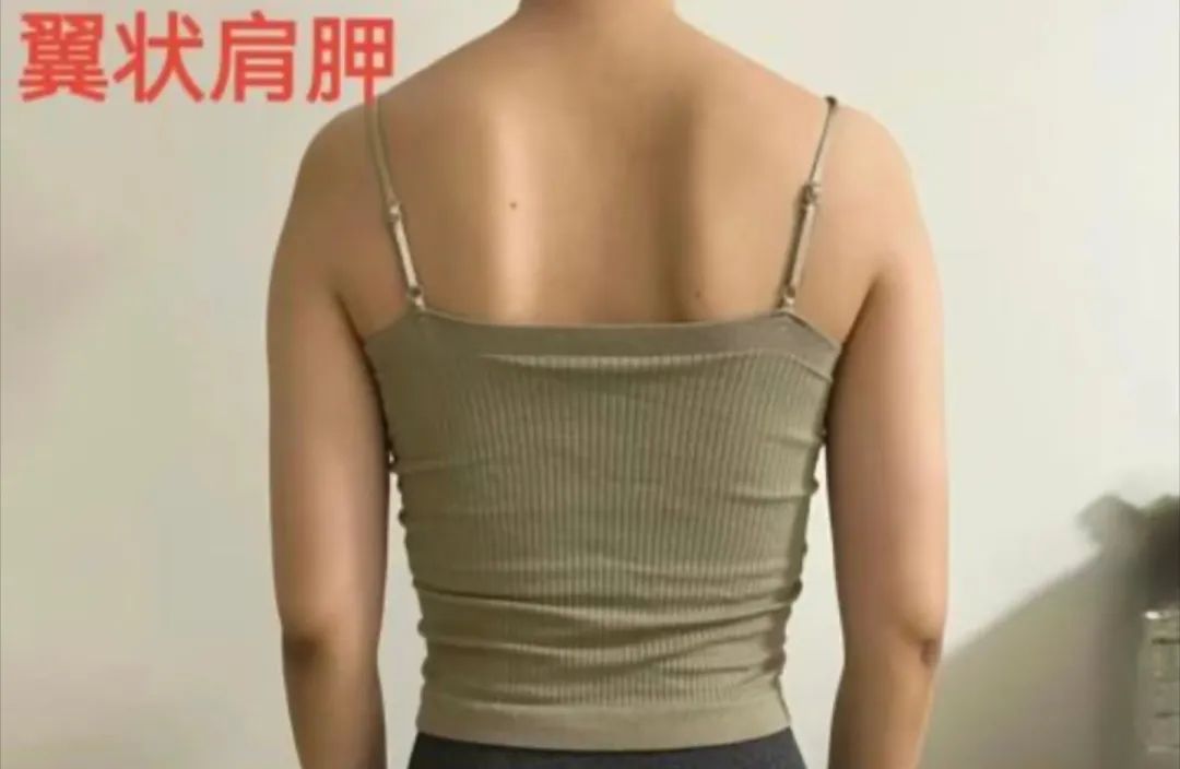 如果你很用力地去挺胸,把胸椎曲度拉直了,那么肩胛骨就无法很好地贴合胸廓,表现为肩胛骨内侧翘起来——这就是我们常说的“翼状肩胛”。