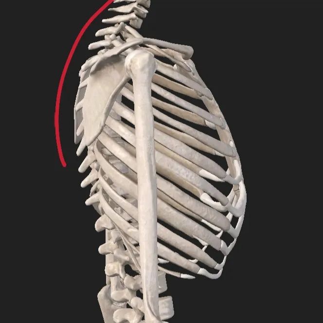 还有,我们的胸椎本身是有一个天然向后弯的生理曲度的。在这个状态下,我们的胸廓是一个圆弧状的结构,而肩胛骨则是自然贴附在这个弧面上的。
