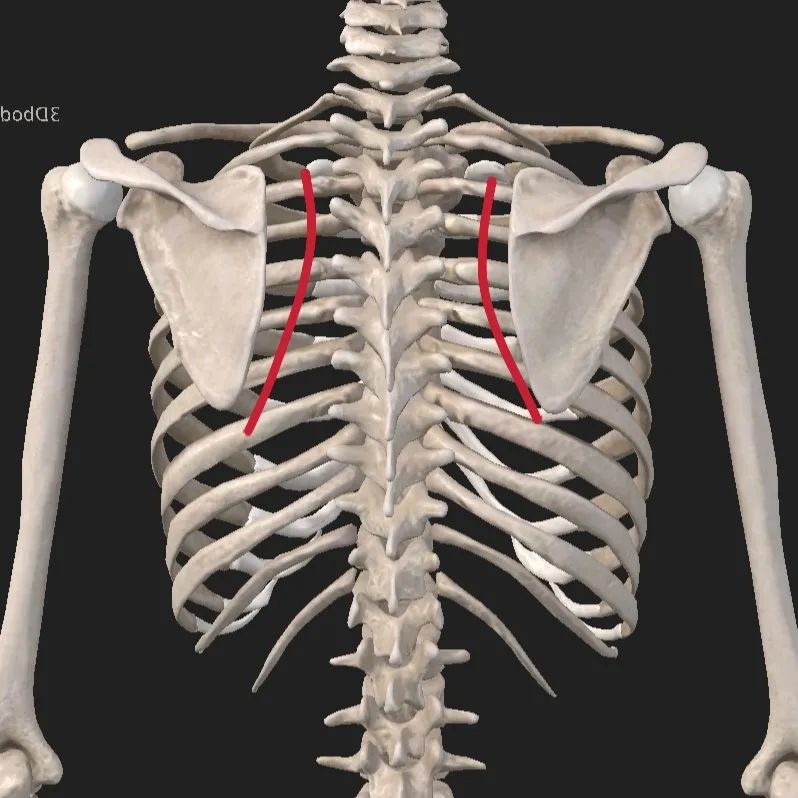 当我们处于静态、手自然垂下不动的时候,肩胛骨的位置应该是贴合胸廓,并且肩胛骨的内侧缘呈一个正八字形状。