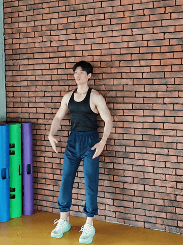 ① 靠墙站立,双脚与肩同宽,往前一个脚掌,膝盖微屈;